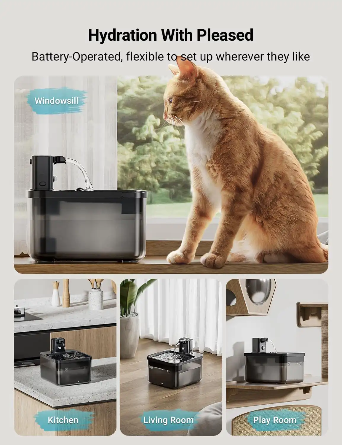 • A Stand-alone Water Fountain For Your Cat-Battery operated cat water fountain, with no attached cord, giving you more freedom to set it up wherever your pets prefer, like their playrooms, your kitchen, bathroom, windowsill, or beyond; Encouraging your furbabies to drink more water. Moreover, there are no wires to trip over or get chewed on by those little mischief-makers. Safer hydration without any worries