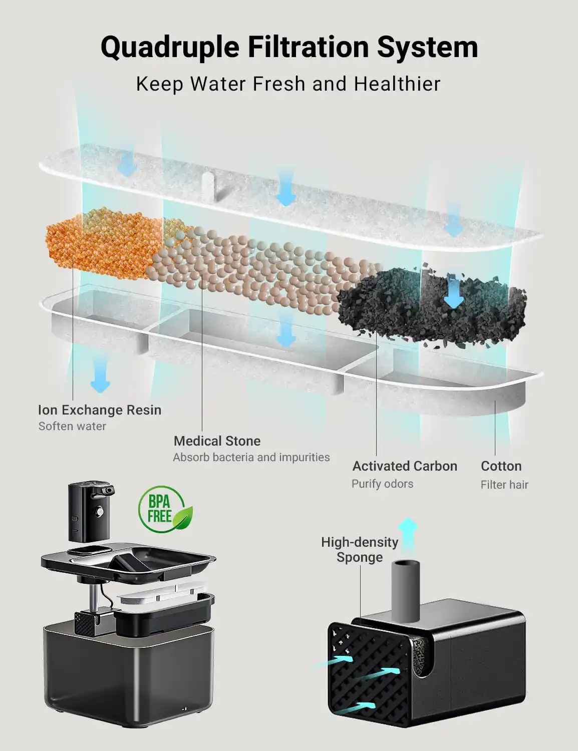 • Enjoy Every Sip of Fresh Water – The 5-level filtration system continuously provides fresh and healthy water to your pets. 1.Activated carbon removes bad taste and odor 2.Ion exchange resin could soften the tap water 3.Medical stone removes heavy metals and releases trace elements 4.Non-woven fabric could filter hair and impurities 5.The high-density sponge of pump helps remove fine particles